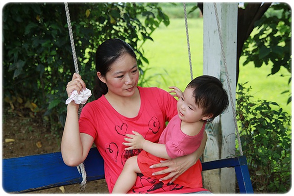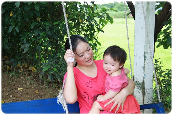 有一個藍色的盪鞦韆,馬上抱卉卉坐坐!但是她今天好像不太愛....馬上就要下來了!