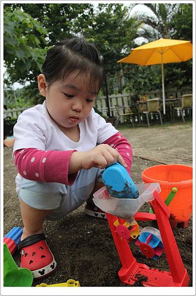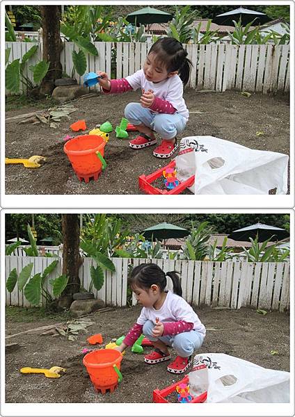 因為卉卉爸前一天晚上沒睡好,所以就先在房間休息~~我先帶著臭小孩來挖砂!