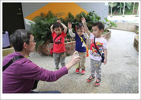 噗噗爸在幫幾個小孩噴防蚊液~~只是,你幹嘛要叫他們舉手啊????