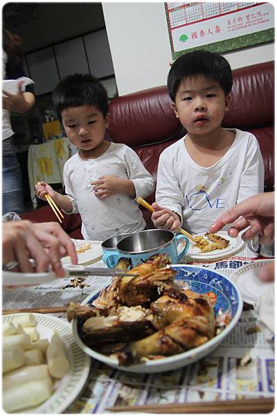 兩個說要幫爺爺遞盤子,在幫爺爺把烤好的東西拿進來....