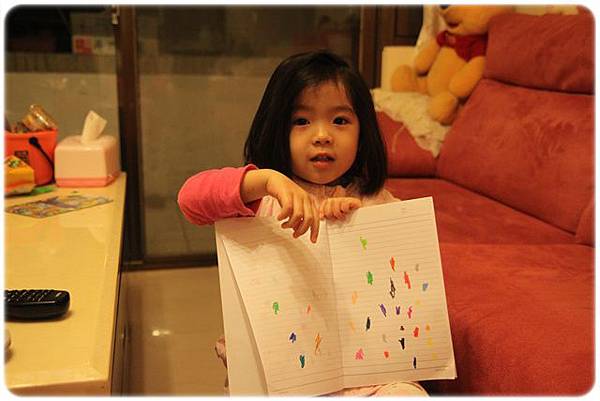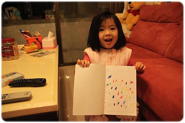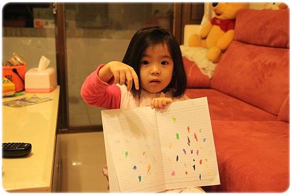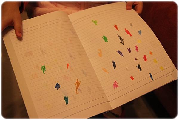 畫了一張紙,說是弟弟的彩色書,其實,就是跟她手上拿的一樣的畫法啦!