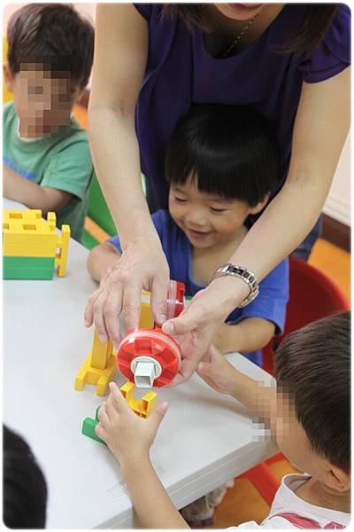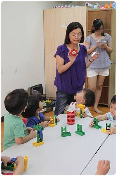 像這裡,肉元把兩隻腳組的方向不同,老師也會拿出他的小模型來讓小孩觀察,讓他自己把腳給改過來!